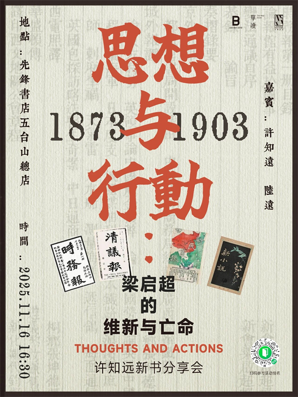 时至今日,梁启超的名字已逐渐在历史中蒙尘,但他的思想遗产早已无声融入了我们的文明。一百多年前他在《少年中国说》中写下的“少年强则国强”仍被我们吟诵,他对现代中国所做的构想依然占据着公共讨论的核心。正如许知远在《梁启超:维新1873-1898》中所言“在历史书写中,他至关重要却又面目模糊”。11月16日,作家许知远将携《梁启超:维新1873-1898》与《梁启超:亡命(1898-1903)》两部著作,来到先锋书店五台山总店,与学者陆远一同展开对谈。他们将重返梁启超的历史现场,探讨思想与行动如何彼此转化、相互滋养。