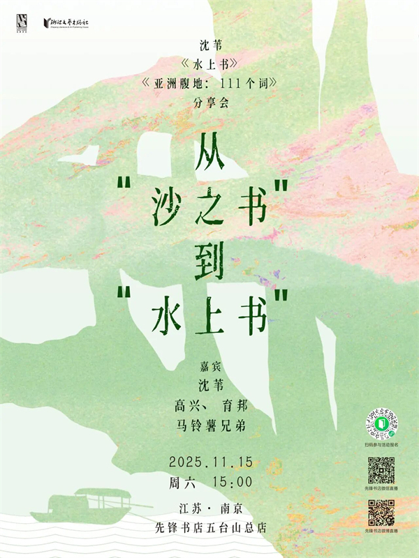11月15日,作家沈苇将带着新书《水上书》《亚洲腹地:111个词》,与学者高兴,诗人育邦、马铃薯兄弟一同来到先锋书店五台山总店,讲述从“沙之书”到“水之书”的故事,漫谈文学的故乡与远方、写作者的离去与归来。
