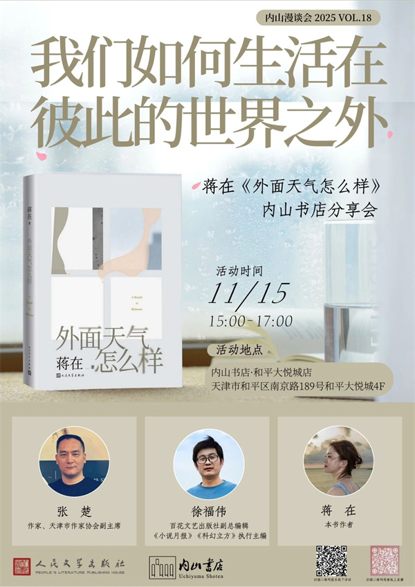 11月15日下午,青年作家蒋在带着她最新创作的新书《外面天气怎么样》,与著名作家张楚、《小说月报》执行主编徐福伟一起走进天津内山书店的暖光里,和我们聊聊那些“在彼此世界之外” 的孤独,还有藏在生活缝隙里的温度。