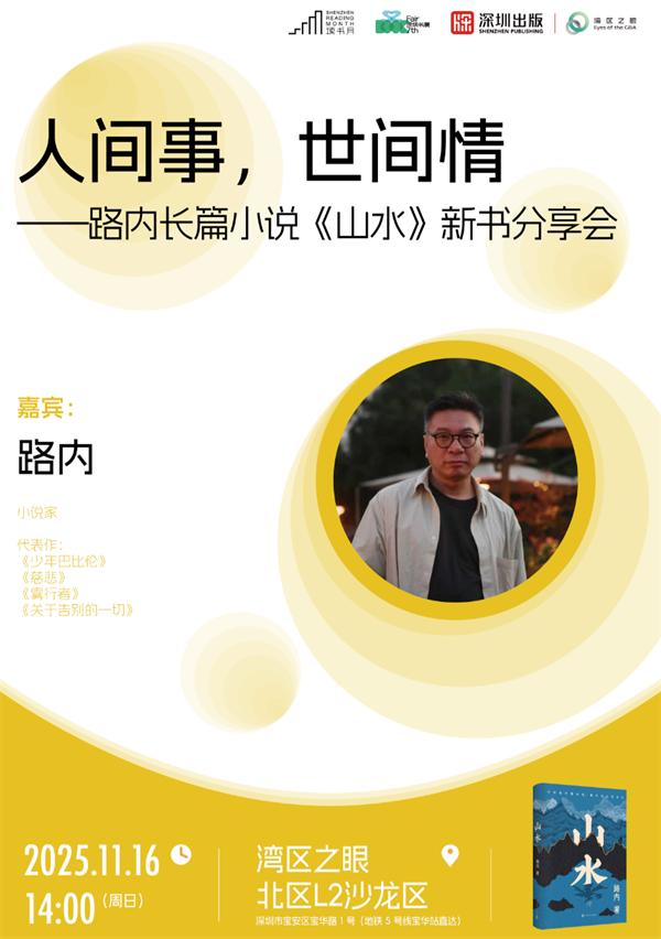 看故事,看人,看人生活,小说的智慧亦是人生的智慧,在复杂中学习如何长成一个人?小说家又如何用一支笔,勾勒出生活的形状?11月16日下午,路内做客湾区书城,分享生活之上,小说内外,如何做成《山水》。