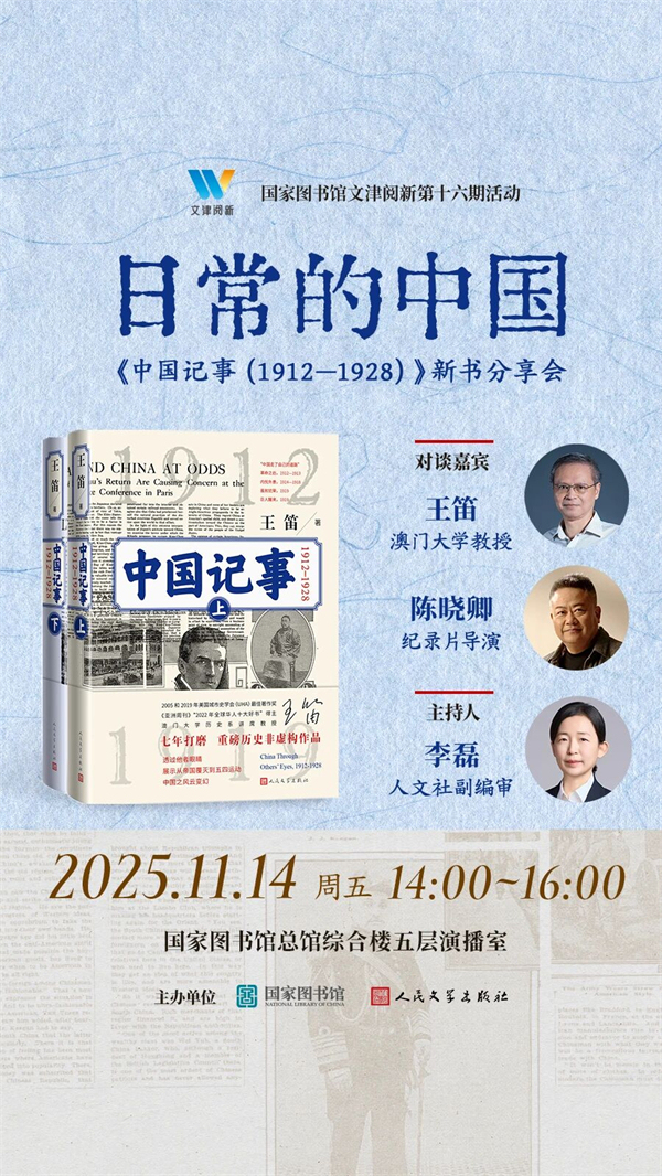 历史,远不止这一面。在这些宏大历史与风云人物背后,是成千上万普通人的真实生活——他们穿什么款式的衣服出门?一日三餐都吃些什么?住的房子、走的街巷,又是怎样一番景象?风土人情如何?情感生活是怎样的?南方和北方多个城市有什么样不同的日常生活的特点?王笛教授长期致力于微观史与日常生活史的研究。这些问题的答案,就藏在他的新书《中国记事(1912-1928)》里。11月14日下午,欢迎各位读者朋友走进国家图书馆,与王笛教授、陈晓卿导演一起,从百年前的衣食住行中,感受一个真切、生动、属于每个人的“日常的中国”。