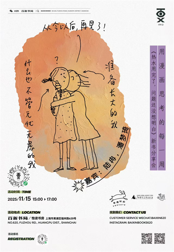 “一周”是漫画作家陆冉自2023年末开启的全新创作挑战,每周日准时上线,目前仍在持续更新中。现在,“一周”首次精选成书《热水用完了,问题还没想明白》。这是一份充满诗意与哲思的“日常生活说明书”,一份画出i人内心世界的“精神状态诊断”。此次新书分享会中,陆冉将与大家分享漫画背后的灵感来源,聊聊如何用“每日一画”关心自己,向日复一日的生活致敬。
