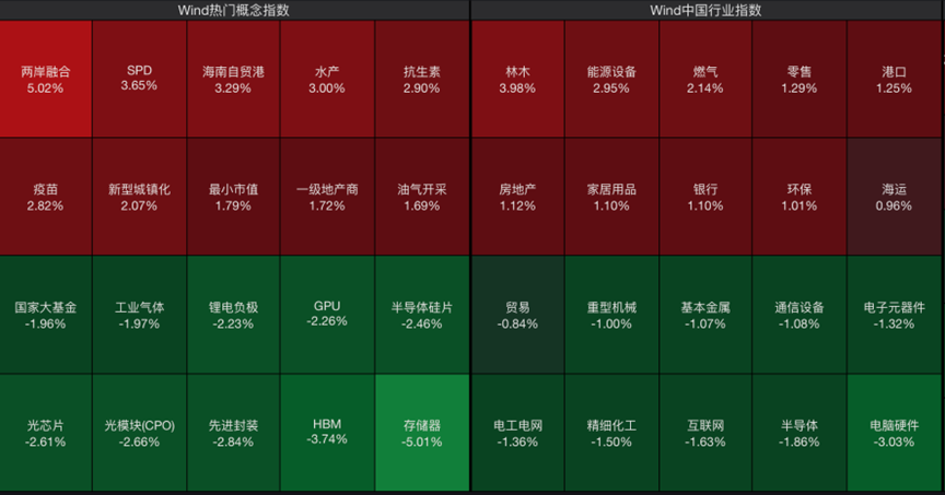 从板块看,银行板块全线飘红,海南、福建板块反复活跃,燃气股、商业医药股走强;而半导体、电脑硬件、有色金属板块走弱,存储芯片、算力硬件、光模块等概念板块集体回调。