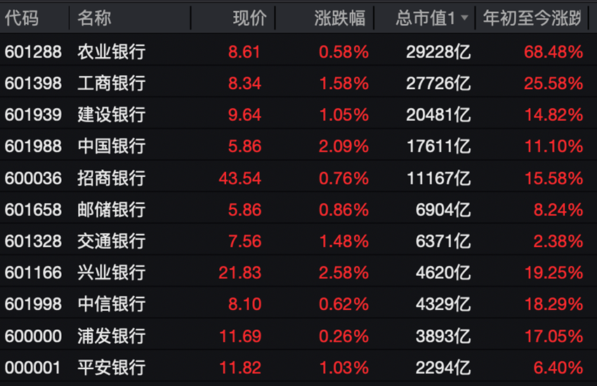 涨幅方面,上午、涨超2%,农业银行涨0.58%,工商银行、、、、等纷纷上涨。