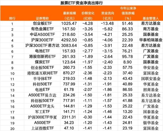 在净流出前20大股票ETF中,宽基方面,2只创业板ETF合计资金净流入超过15亿元;3只沪深300ETF资金净流入接近9.5亿元;4指中证A500ETF资金净流入接近9亿元。行业主题方面,单只有色金属ETF净流出超5.8亿元,2只电池相关ETF合计净流出5亿元,煤炭、半导体、军工等方向ETF净流出也偏多。