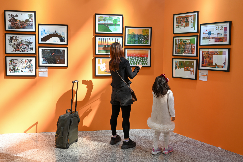家长带着小朋友在看金风车国际青年插画家大赛作品。本次金风车国际青年插画家大赛共收到来自78个国家和地区的2,828份作品,展会现场展出69组入围作品。澎湃新闻记者 朱伟辉 图