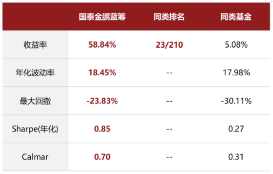 以其代表产品国泰金鹏蓝筹为例,胡松自2020年9月25日管理以来,胡松任职以来基金取得75.63%的正收益,年化收益11.87%,相对业绩比较基准(同期总回报11.34%)和同类基金平均(同期总回报24.65%)的超额收益明显。