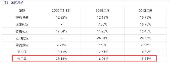 据公告显示,长江星前五大客户之一的湖北长江大药房连锁有限公司(以下简称“长江连锁”)持有长江星60.41%的股权,为其控股股东。据草案显示,2018年、2019年、2020年1-3月,长江星对长江连锁及其关联方的销售金额分别为9117.74万元、9738.28万元、8374.21万元,占其营业收入总额的比重分别为6.90%、8.01%、34.85%。
