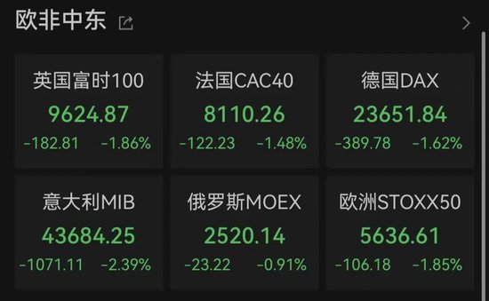 除黄金与白银,欧洲股市也全线大跌,截至发稿,英国富时100指数跌超1.8%,法国CAC40指数与德国DAX指数跌幅均超1.4%。