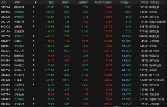 市场共计1961只个股收涨,涨停股89只;3323只个股收跌,跌停股9只。日成交额破百亿的个股仅6只,且悉数收绿:成交123亿元居首,股价跌近3%报185元;重挫9.55%报205.78元;、、分别跌近4%、近5%、逾5%。