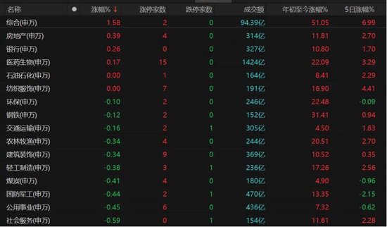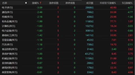 电子、通信、传媒、有色金属、计算机、电力设备等板块领跌,基础化工、非银金融、汽车、食品饮料、美容护理等板块跌幅不低于1%。