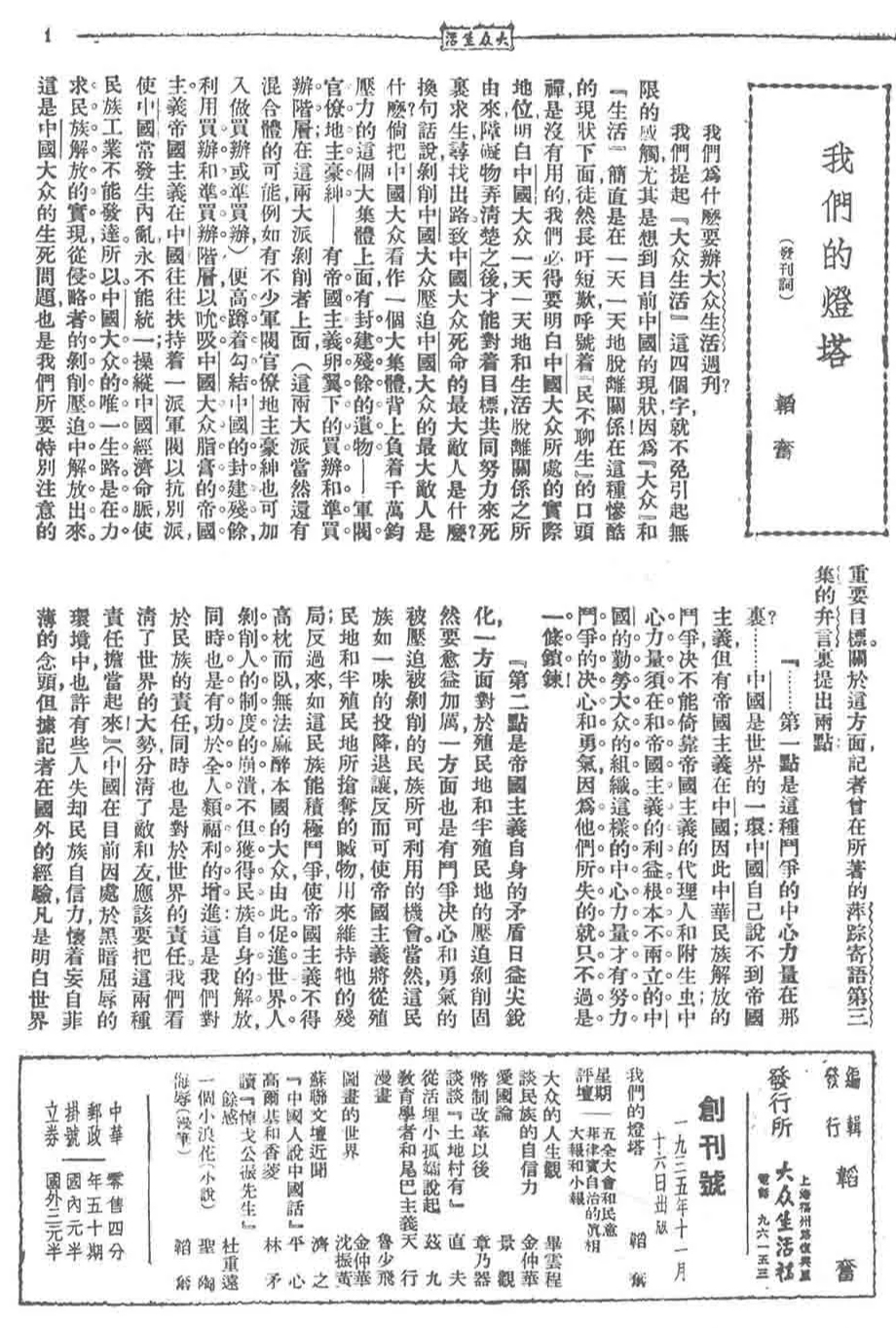 《大众生活》是1935年11月16日在上海创刊的时事性综合周刊。编辑人、发行人为邹韬奋。杂志为16开40页,办刊地址为上海福州路复兴里。邹韬奋在题为《我们的灯塔》的发刊词中宣布“力求民族解放的实现,封建残余的铲除,个人主义的克服”为该刊的三大目标。主要发表时事论文、学术论文、国内外通讯、随笔小品及漫画,形成了既浅显通俗,又严肃高雅的风格。