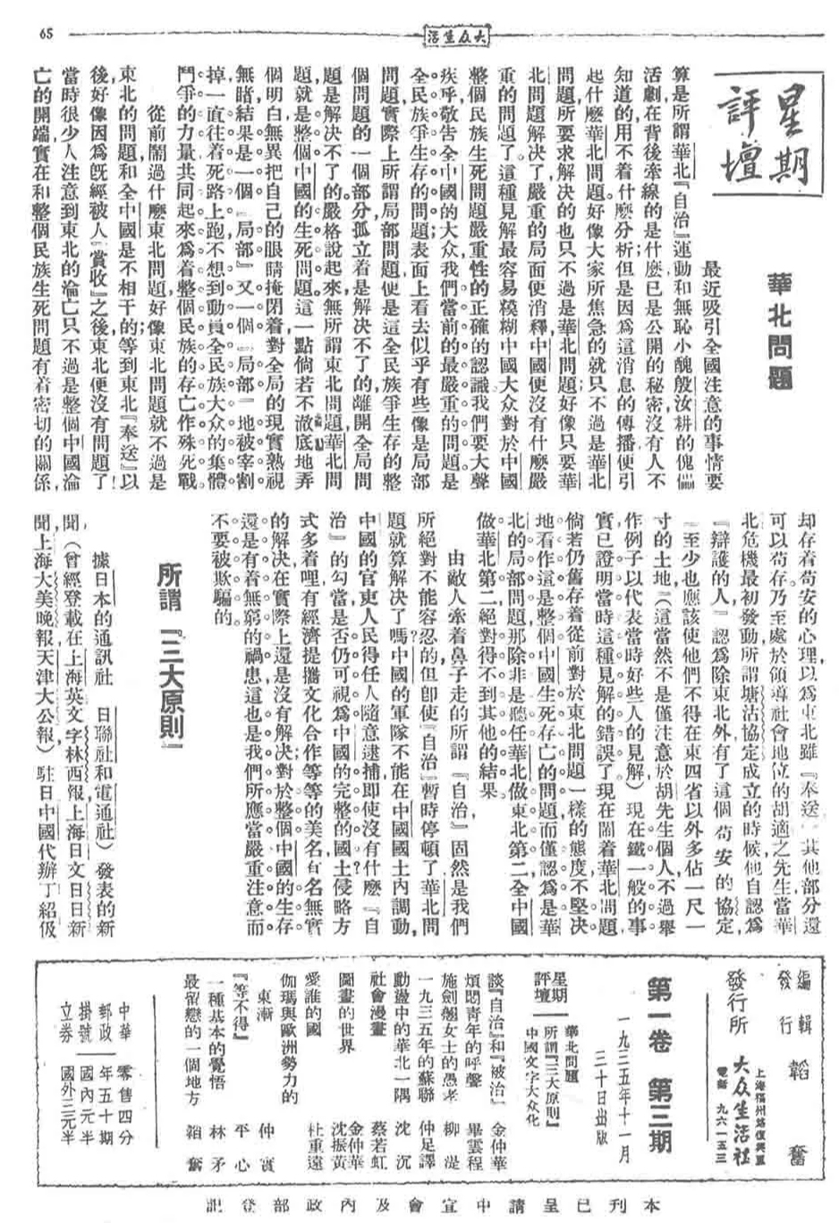 《华北问题》,《大众生活》第1卷第3期,第1页