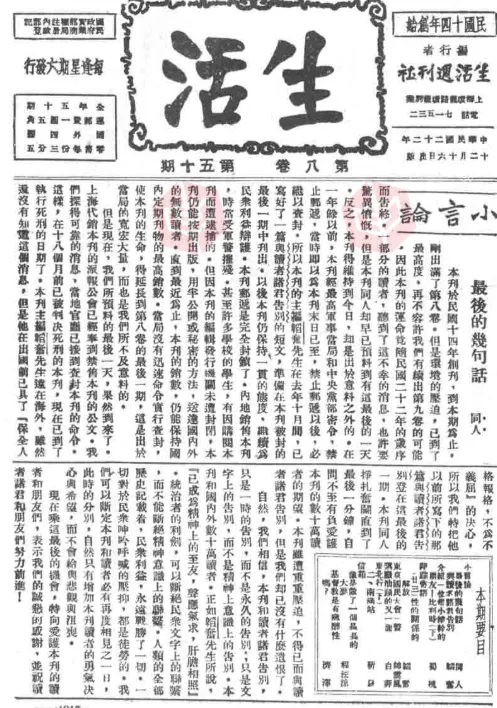 1933年12月初,上海代派《生活》周刊总报贩接上海市政府情报处通知,不准销售《生活》周刊,1933年12月8日,国民党政府以“言论反动、思想过激、毁谤党国”的罪名下令查封《生活》周刊。12月16日,《生活》周刊发行至第8卷第50期被迫停刊。