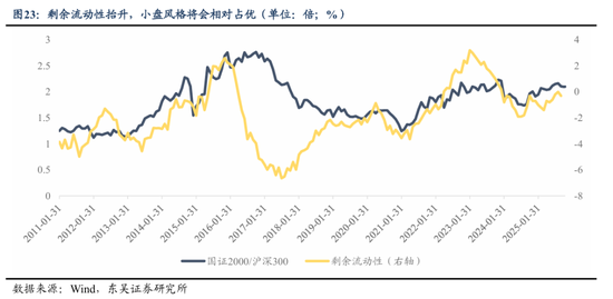 2.3. 大/小盘风格,怎么看?近年来,随着量化私募的快速发展,大小盘风格的定价逻辑已不仅取决于宏观剩余流动性,还愈发受到资金结构切换的影响。小微盘股在核心资产行情暂歇时,常成为反机构配置的选择,呈现出一定的博弈特征。宏观视角下,剩余流动性与大小盘风格轮动相关,表现为剩余流动性抬升,小盘风格将会相对占优。背后的逻辑在于,经济复苏初期,央行会率先进行宽货币,而财政政策出台速度偏缓,落地推进的节奏落后于货币政策。因此实体经济需求的复苏往往会滞后于货币供应增加,使得大量的流动性留存在金融体系中,造成剩余流动性抬升。而在经济复苏初期,由于政策底已现,市场风险偏好改善,同时小盘业绩弹性更佳,因此市场会给予小盘股更高的估值,在这一阶段小盘股往往表现更佳。展望明年,随着资金逐步进入实体,剩余流动性大幅上行可能性偏低、有望趋于平稳,小盘风格的相对优势将随之减弱。