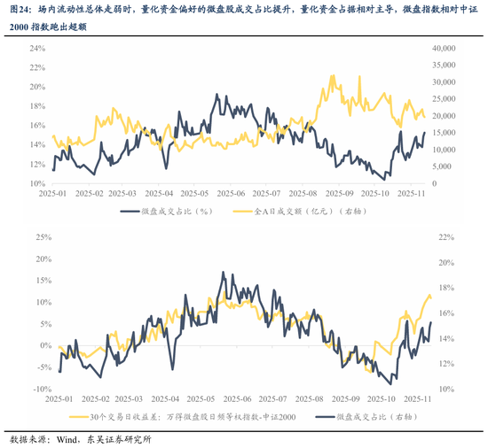 从微观资金结构切换来看,我们认为中长期维度下,小微盘的超额收益将明显减弱。过去几年小盘,尤其是小微盘的崛起,主要依托于量化私募的规模快速扩张。在场内流动性整体偏弱、缺乏增量资金的阶段,量化资金常成为边际定价的主导力量。为了在存量博弈环境中博得收益,量化资金采取市值下沉策略,带动微盘股成交占比提升,微盘指数相对中证 2000跑出超额。