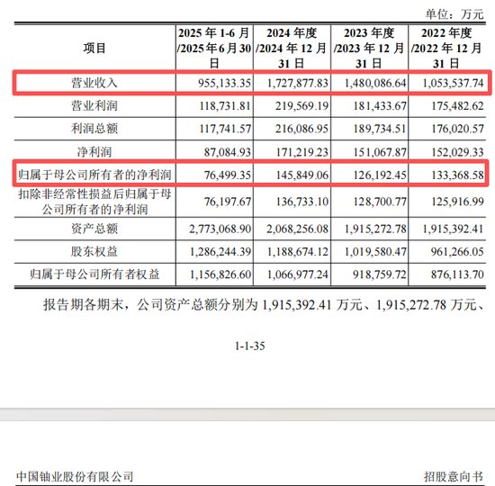 2022年至2024年及2025年上半年,中国铀业的营业收入分别为105.35亿元、148.01亿元、172.79亿元及95.51亿元,归母净利润分别为13.34亿元、12.62亿元、14.58亿元及7.65亿元。