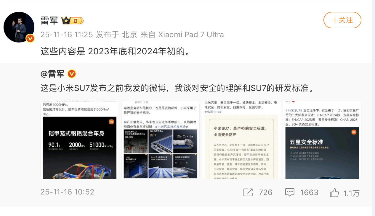 11月16日,小米创始人、董事长兼CEO雷军连发多条微博,回应相关质疑,再次就小米汽车安全理念进行说明。