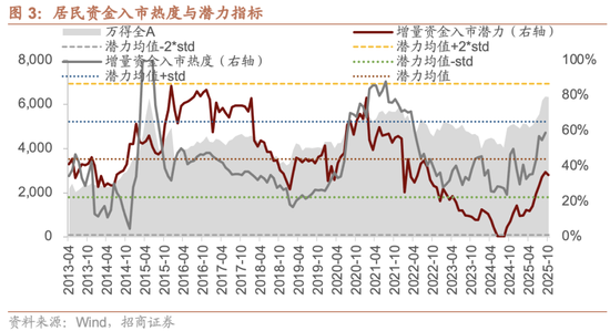 因此我们认为,随着M1、M2、社融等总量指标相继回落,宏观流动性驱动的逻辑会边际弱化,股市上行斜率有所放缓,但并不意味着行情的结束。第一,我们看到PPI持续回升,降幅连续收窄,有利于改善市场对未来的盈利预期,PPI回升正成为市场的另一条交易主线。第二,岁末年初,政策将逐渐为明年经济增长积蓄力量,明年增量财政货币政策的实施有望在明年对M1形成一定支撑。第三,从存款变动来看,10月居民存款同比多减7700亿元;非银金融机构存款同比多增7700亿元,这可能主要与跨季后存款转存理财有关,具有一定的季节性特点,同时也表明居民存款搬家仍在进行中。按照我们构建的居民资金入市指标体系,居民入市潜力指标尚处于历史均值以下,距离均值+1倍标准差的高点有较大差距,居民资金入市潜在空间仍大。