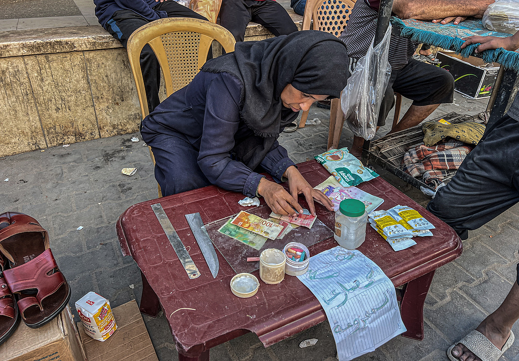 当地时间2025年11月11日,加沙地带中部努赛赖特,由于加沙地带硬通货短缺,巴勒斯坦人马纳勒赛达尼修复旧钞。