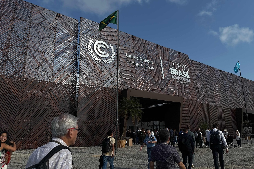 当地时间2025年11月10日,巴西帕拉州贝伦,人们走过COP30联合国气候变化大会主入口。