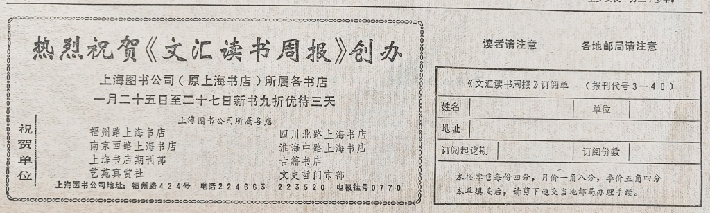 《文汇读书周报》的报头也是我们三个一起设计的,花了不少心思,“文汇”用的本报刊头字书,“读书周报”四字是集的鲁迅的字体。《读书周报》有四个版,起初在《文汇报》中附赠发行了几期,为的是让读者先认识它。后来就独立出版了,定价四分钱,发行量很快一路上升。应该说,这份报纸的创办适应了读者对书讯书评的需要,也契合了当时中宣部加强出版引导、加强书评和图书宣传的要求。