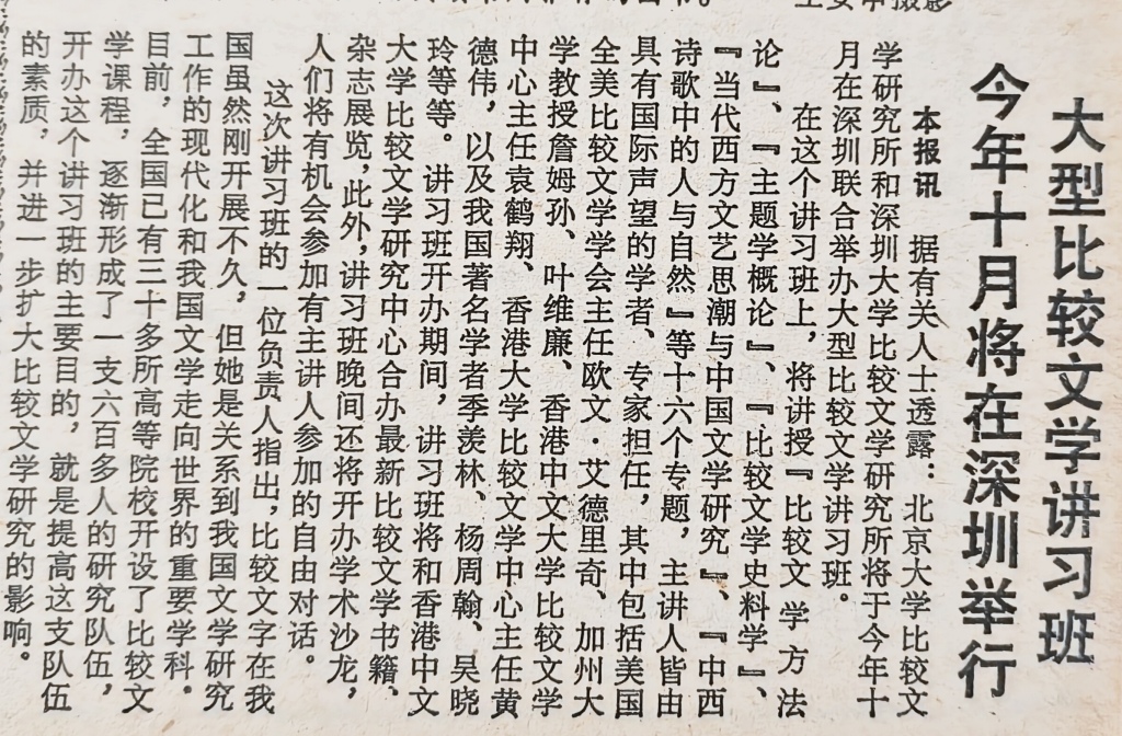 本报讯:《大型比较文学讲习班今年十月将在深圳举行》