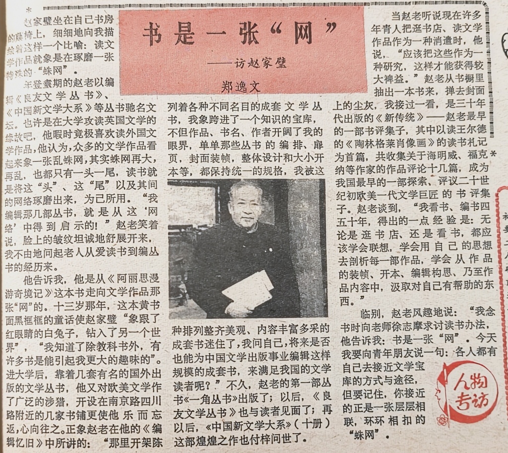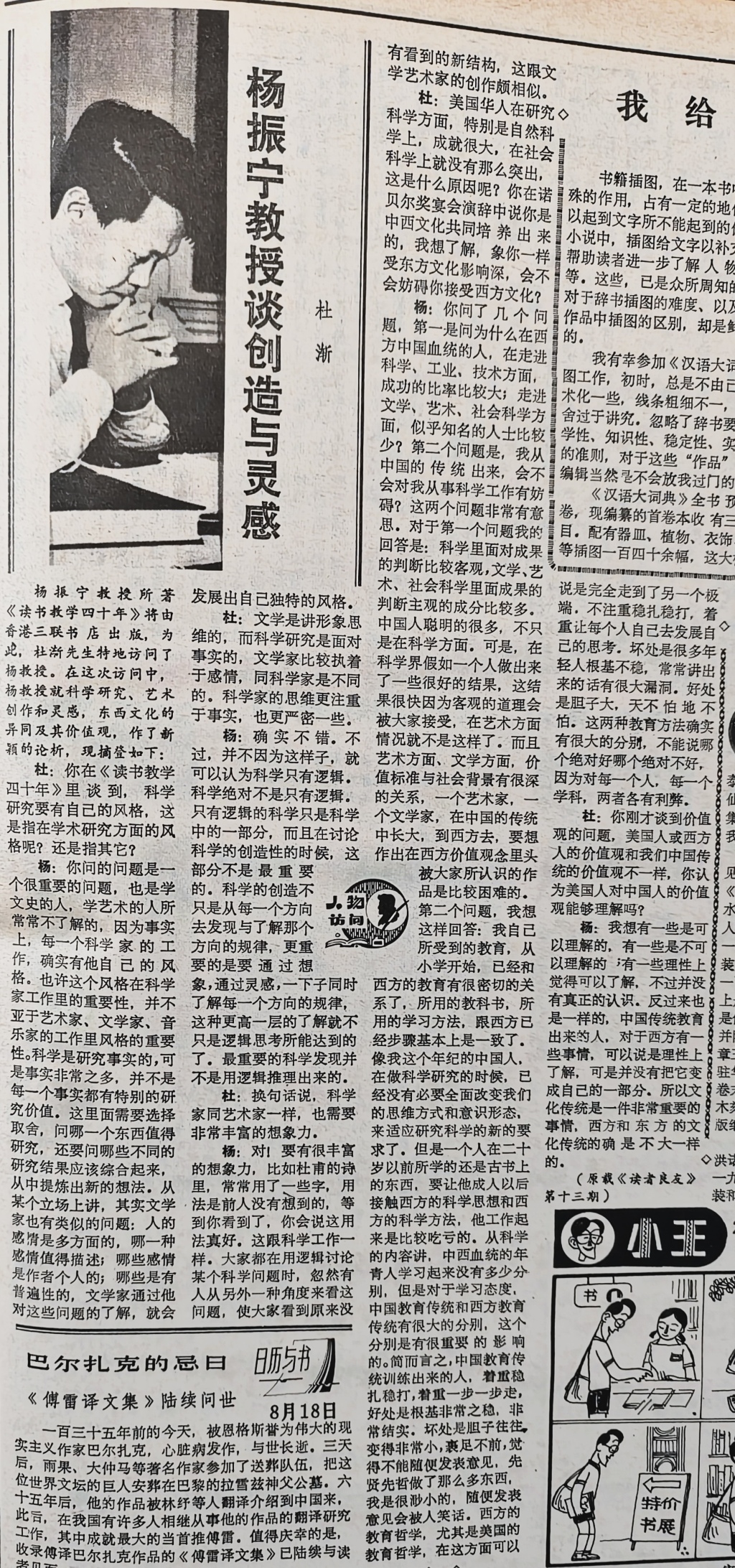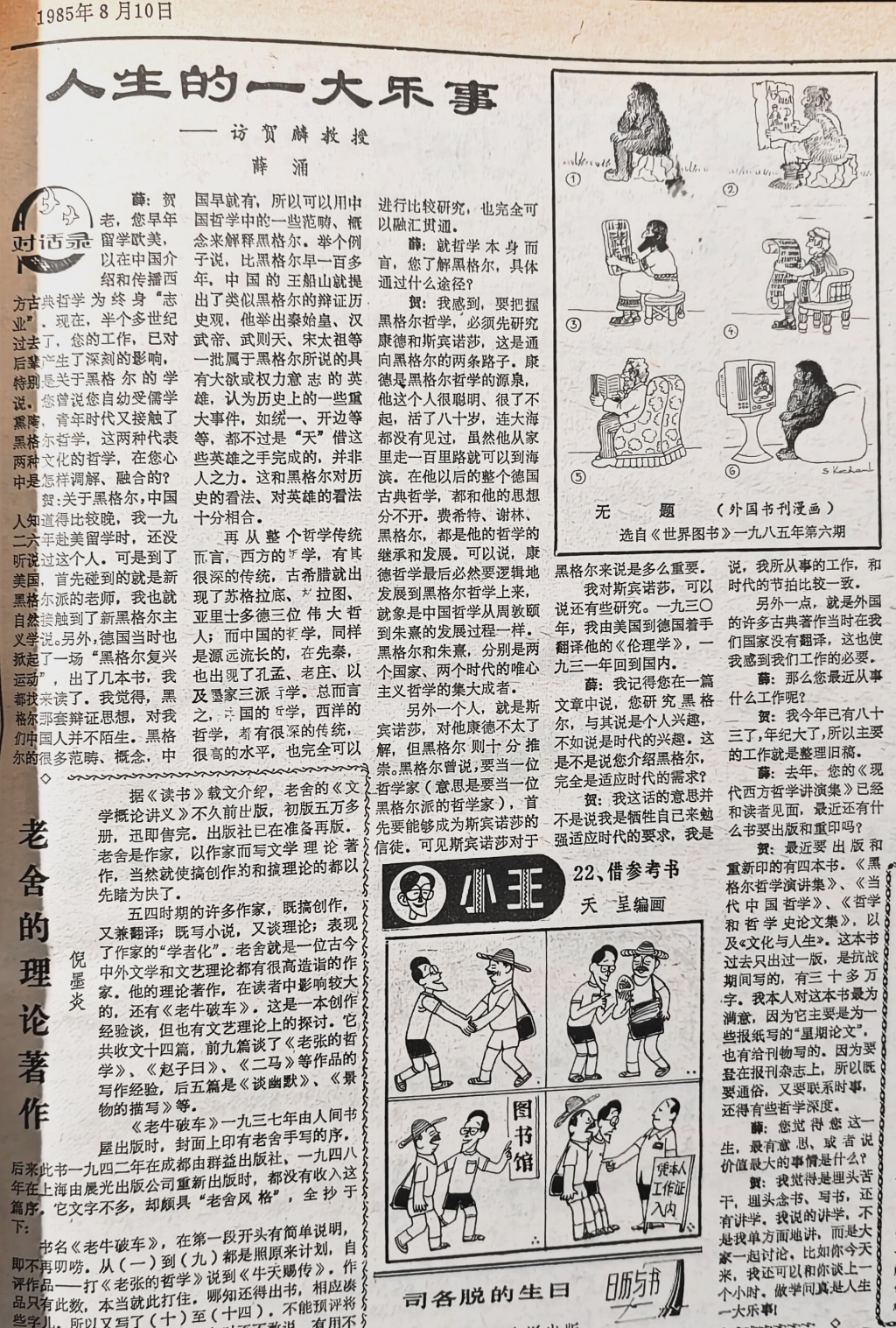 当时帮我们做专访最多的是一位青年才俊——薛涌,如今他是著名的旅美学者。他为《读书周报》采访的对象:梁漱溟、冯友兰、贺麟、王力、费孝通、林庚、萧乾、洪谦、吴冠中、汤一介、庞朴、陈贻焮、李泽厚、柳鸣九、金观涛……都是那时在中国人文领域最具影响力的一批学者。我们对文化名人的专访,在文化界和读者间引发了不少回响。
