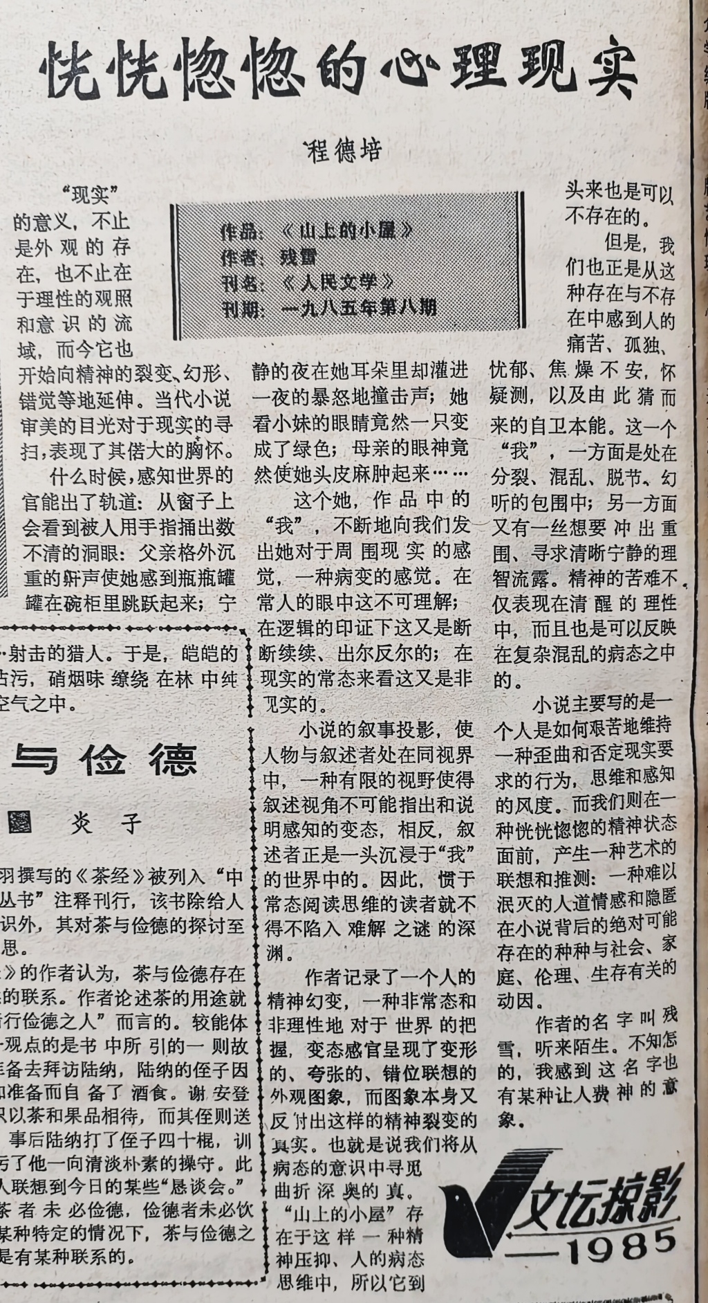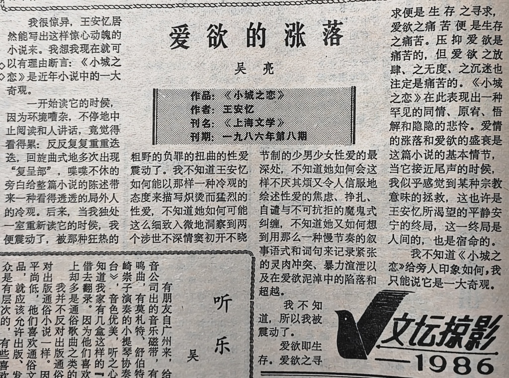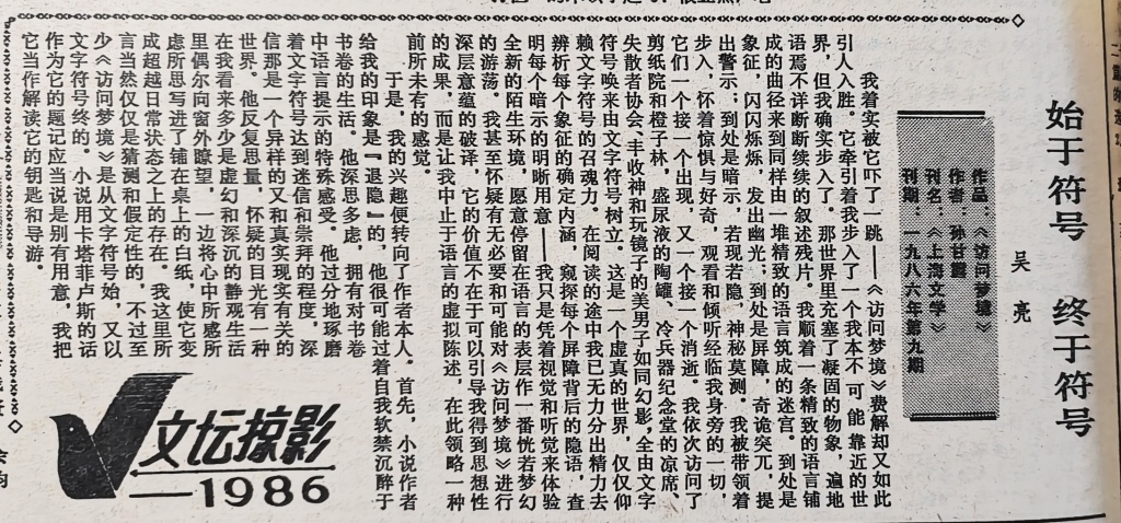 再比如,“小说梗概”这个栏目,就是长篇小说的故事缩写,这是我们的一项重要创意。那时候信息还不发达,很多电影、电视剧改编时,都参考过我们这个栏目。还有年轻评论家吴亮、程德培开设的专栏“文坛掠影”,一篇只有五六百字,点评一篇文学新作。后来成为当代文学精品力作的许多小说,都是首先在这个专栏得到关注的。