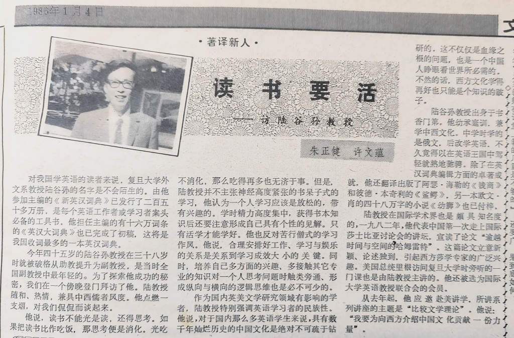“著译新人”:朱正健、许文蕴:《读书要活——访陆谷孙教授》