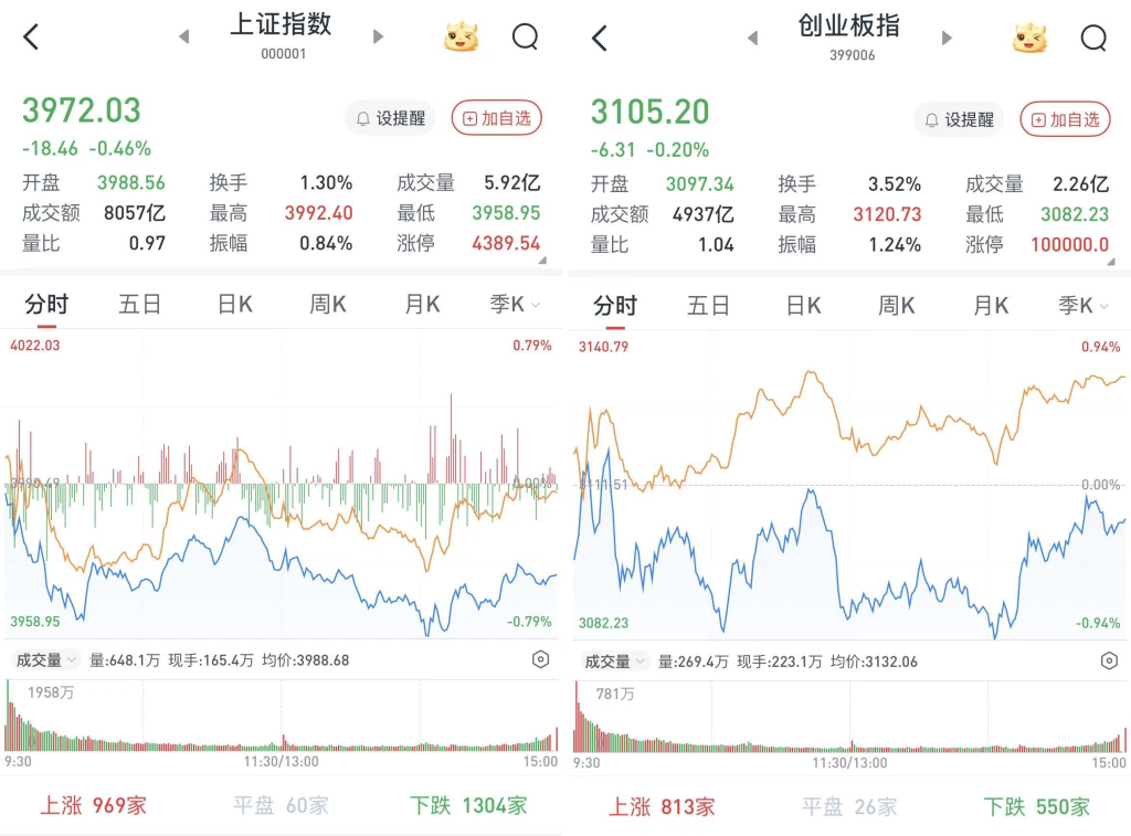 至收盘,上证综指跌0.46%,报3972.03点;科创50指数跌0.53%,报1354.04点;深证成指跌0.11%,报13202点;创业板指跌0.2%,报3105.2点。