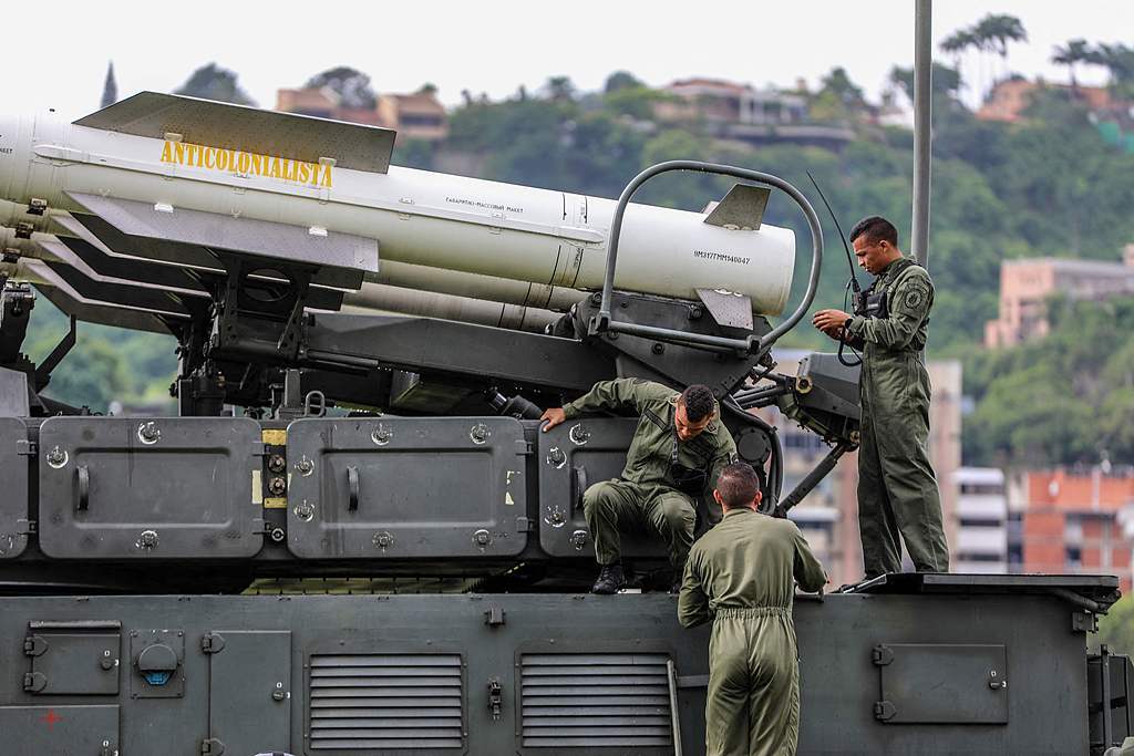 当地时间2025年11月11日,委内瑞拉加拉加斯,委内瑞拉玻利瓦尔国家武装部队士兵在一次训练演习中检查一枚俄罗斯制造的Buk M2E导弹系统,导弹上写着“反殖民主义”。视觉中国 图