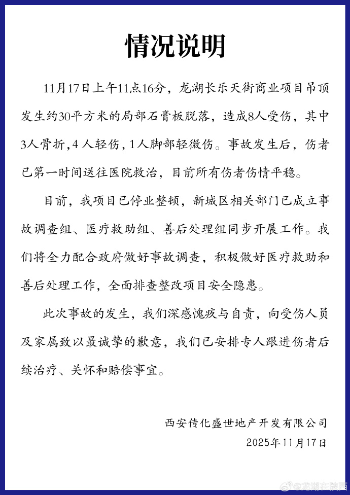 11月17日,有网友发布视频称,陕西省西安市一商业项目局部石膏板脱落发生吊顶脱离事故,有顾客被砸受伤。17日下午,官方发布通告称该项目已停业整顿,事故原因正调查。