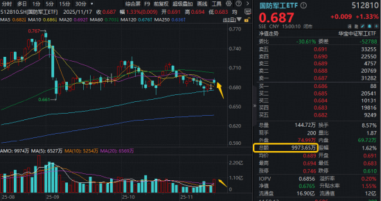 技术面上看,国防军工ETF(512810)受大市影响收出阴线,仍放量连收5日及10日均线,全天成交9974万元,环比激增超113%,反映多头势力显著更强。