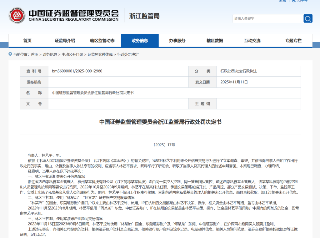 近日,证监会浙江监管局公布了对林艺平利用未公开信息交易行为的行政处罚决定。林艺平因违反《中华人民共和国证券投资基金法》《私募投资基金监督管理暂行办法》及《私募投资基金监督管理条例》等相关规定,被责令改正、警告,并没收违法所得8857.69万元,处以同等金额罚款,合计罚没金额达1.77亿元。同时,林艺平被采取5年证券市场禁入措施。