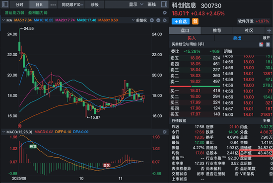 截至11月17日收盘,科创信息股价18.01元/股,总市值43.43亿元。
