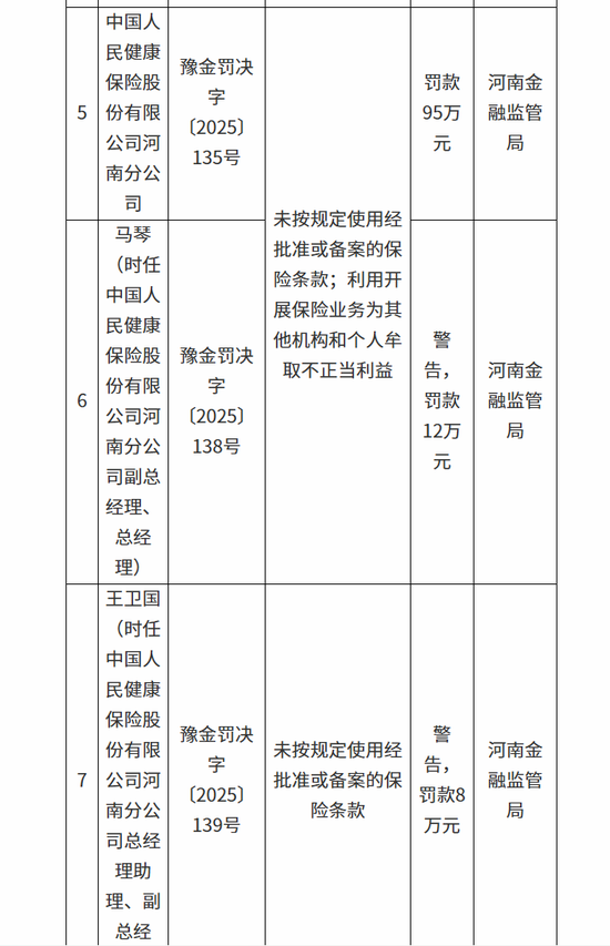 7月31日,河南监管局公布了一则行政处罚决定。具体而言,人保健康河南分公司因“未按规定使用经批准或备案的保险条款”以及“利用开展保险业务为其他机构和个人牟取不正当利益”被处以95万元罚款。时任分公司总经理马琴对上述行为负有责任,被警告并罚款12万元。此事件表明,公司在核心业务环节的规范性和独立性方面存在管控缺失。