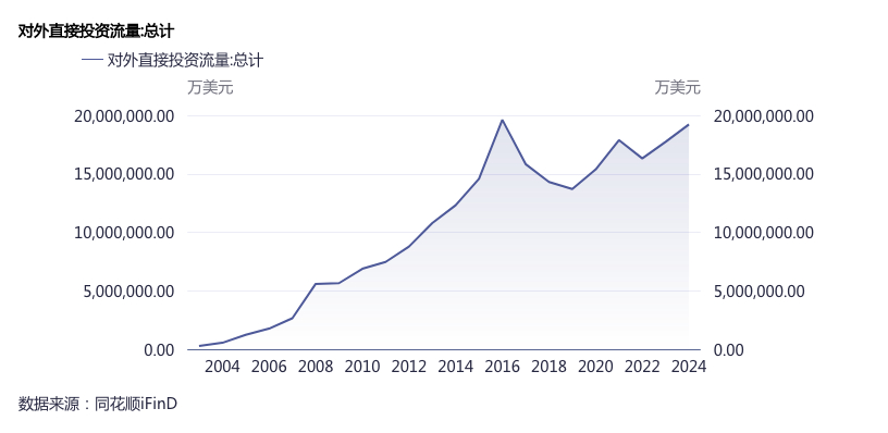 商务部数据显示,本世纪以来中国对外投资稳步增长,至2016年达到约2000亿美元的规模,此后有所回落。不过,2019年以来中国对外投资重回增长的轨道,2024年再度接近2000亿美元,相比2019年增长了45%。