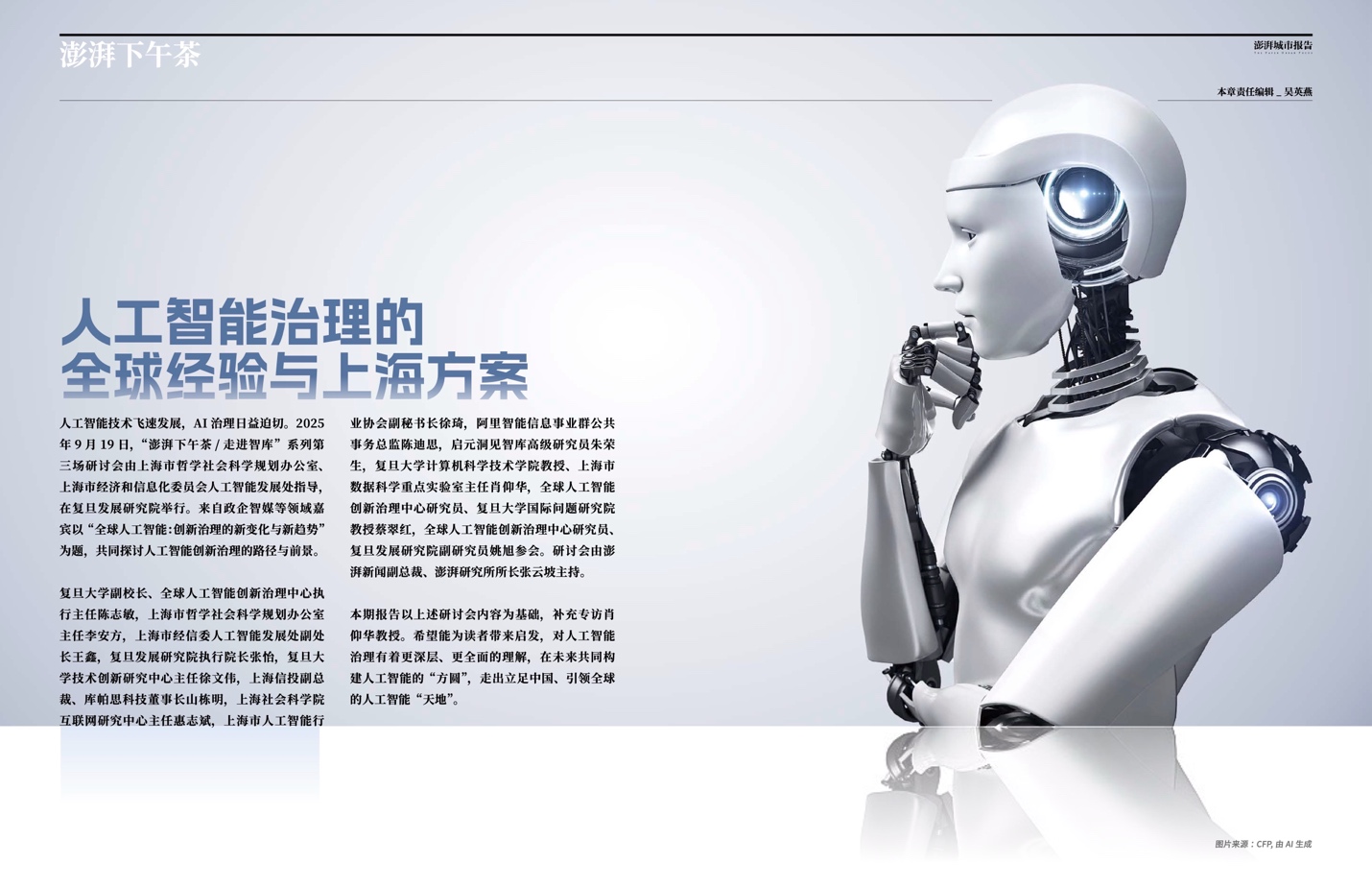 人工智能技术飞速发展,AI治理日益迫切。2025年9月19日,“澎湃下午茶/走进智库”系列第三场研讨会由上海市哲学社会科学规划办公室、上海市经济和信息化委员会人工智能发展处指导,在复旦发展研究院举行。来自政企智媒等领域嘉宾以“全球人工智能:创新治理的新变化与新趋势”为题,共同探讨人工智能创新治理的路径与前景。本期报告以研讨会内容为基础,补充专访肖仰华教授。希望能为读者带来启发,对人工智能治理有着更深层、更全面的理解,在未来共同构建人工智能的“方圆”,走出立足中国、引领全球的人工智能“天地”。