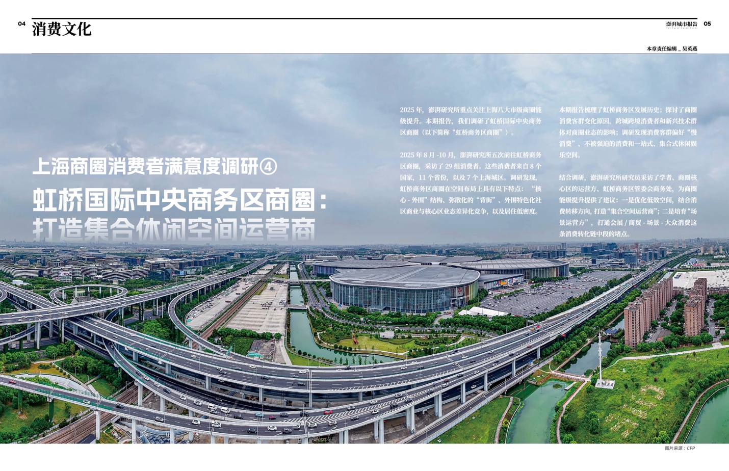 2025年,澎湃研究所重点关注上海八大市级商圈能级提升。本期报告,我们调研了虹桥国际中央商务区商圈。2025年8月-10月,澎湃研究所五次前往虹桥商务区商圈,采访了29组消费者。本期报告梳理了虹桥商务区发展历史;探讨了商圈消费客群变化原因,跨城跨境消费者和新兴技术群体对商圈业态的影响;调研发现消费客群偏好“慢消费”、不被强迫的消费和一站式、集合式休闲娱乐空间。结合调研,澎湃研究所研究员采访了学者、商圈核心区的运营方、虹桥商务区管委会商务处,为商圈能级提升提供了建议。