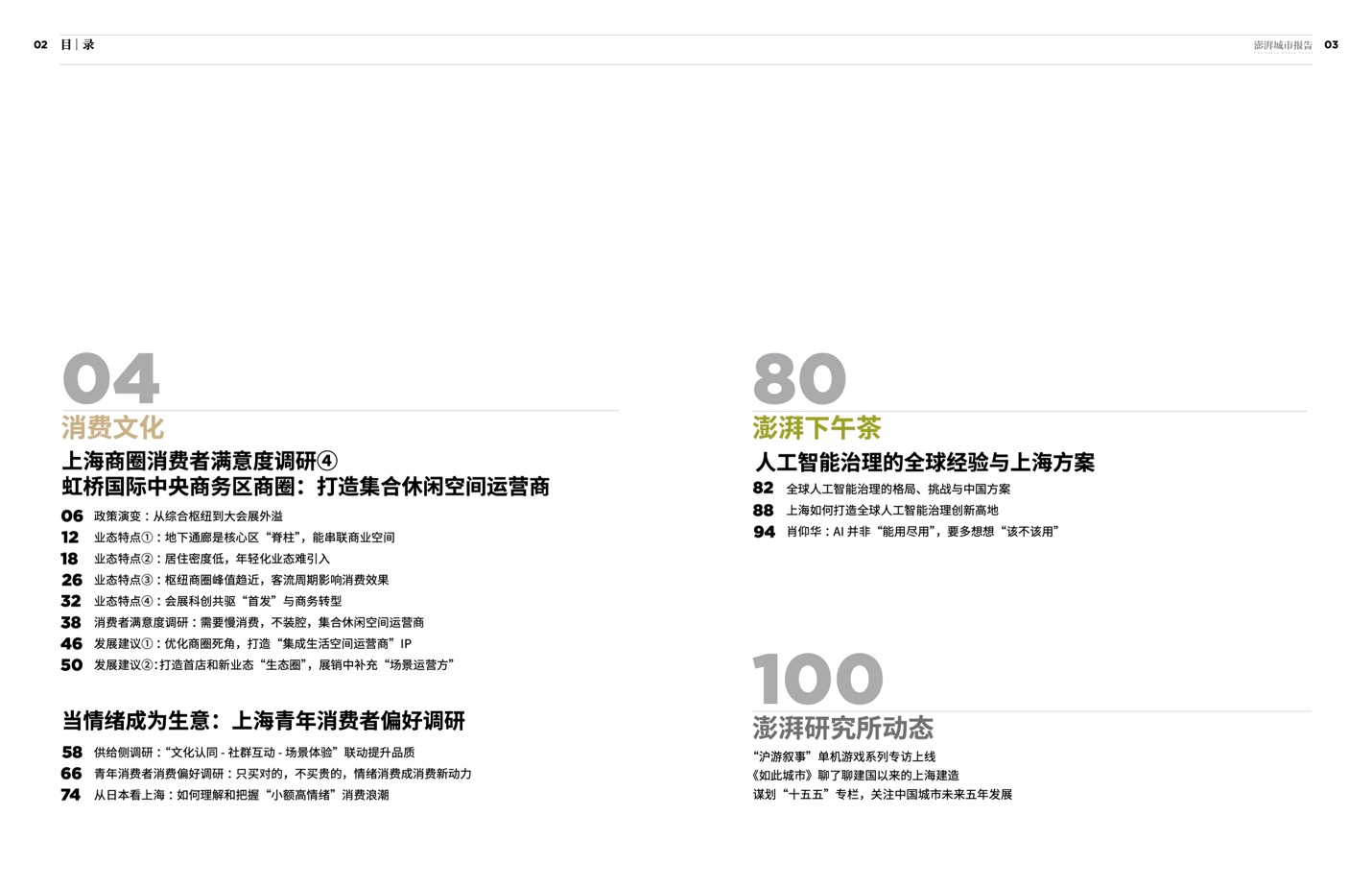《澎湃城市报告》总第29期《上海商圈消费者满意度调研④虹桥国际中央商务区商圈》已于10月25日发布,本报告包含《上海商圈消费者满意度调研④虹桥国际中央商务区商圈:打造集合休闲空间运营商》、《当情绪成为生意:上海青年消费者偏好调研》和《人工智能治理的全球经验与上海方案》3份子报告。