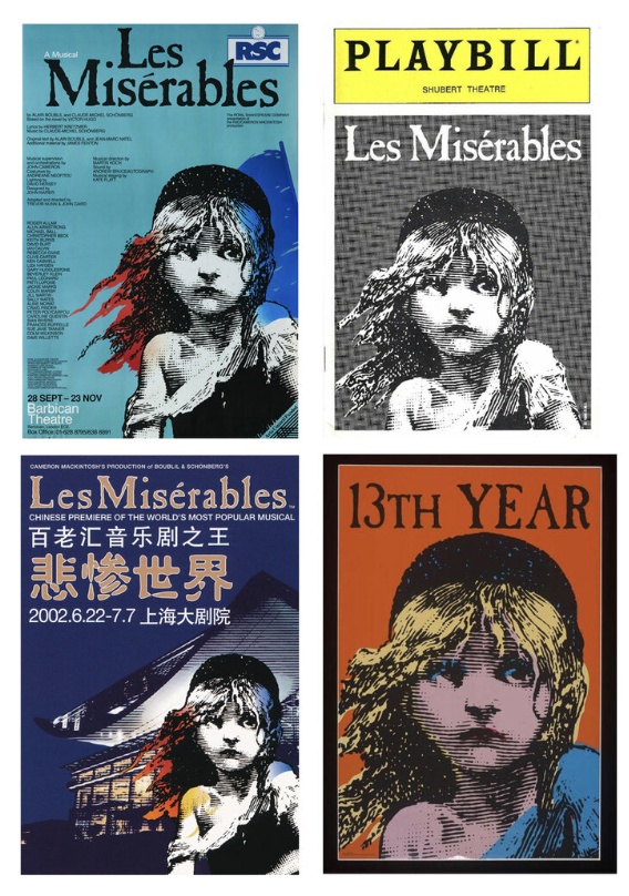 1985年伦敦初版及全球多个制作版本的海报,均使用上述珂赛特画像作为主要元素。