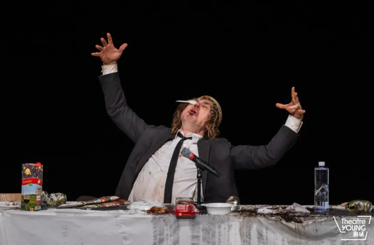 然而这种共情很快被破坏,舞台上的权力关系被进一步具象化为身体间的触碰与羞辱。理查抓起大把白色奶油,用力抹在勃金汉的脸和胸口,对勃金汉大喊:“你看起来像坨屎!”灯光把粘稠的奶油照得反光,理查开始怂恿观众一起羞辱勃金汉。第一遍,不少观众配合应和;第二遍,理查的呼声变得像命令,观众席多了几声不确定的跟随;第三遍、第四遍,舞台下的应和声越来越小,哪怕坐在剧场的远端,观众也能够逐渐意识到,自己与勃金汉僵直的身体共享着同样的的尴尬和恐惧,这场羞辱真的还要继续下去吗?