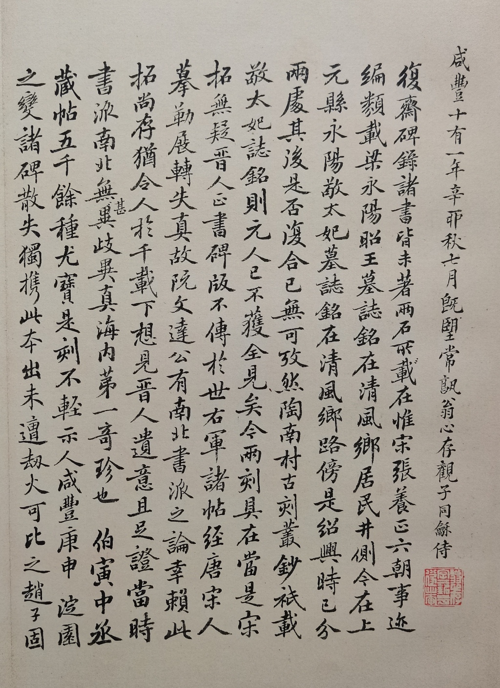 上海博物馆另有同为潘祖荫、吴湖帆递藏的南朝《梁永阳王萧敷暨敬太妃墓志》传世孤本,亦存沈氏隶书旧签:“梁永阳昭王暨敬妃王氏墓志铭,咸丰辛卯七月沈兆霖题。”然清代咸丰皇帝在位十一年,其间纪年干支中并无“辛卯”者,仅元年(1851)岁次辛亥,五年(1855)为乙卯,十一年(1861)为辛酉,而该册后李佐贤(竹朋,1807-1876)题跋中谓:“咸丰己未夏,友人以此本寄售,惊为创见。议值未定,会绂庭三世兄见而爱之,不忍释手,因思宝刻果得其所,公诸友亦无异有诸己也,遂举以相让。绂翁其慎守此宝,勿为他人所夺,可乎?抑亦有以报我,否乎?”绂庭即潘祖荫之父潘曾绶也。又前揭《何绍基日记》中咸丰九年(己未)十月十五日亦记:“刘青园旧得萧梁两墓志古拓,昔与子毅钩且题者,今年入潘伯寅手。”则此本入藏潘家,已在咸丰九年己未(1859),故沈氏题签所署“辛卯”,很可能为咸丰十一年辛酉之误。册中另有翁氏观款:“咸丰十有一年辛酉秋七月既望,常熟翁心存观,子同龢侍。”其时翁氏父子和潘祖荫、沈兆霖等,同在京师,翁氏父子日记中,时有记及。