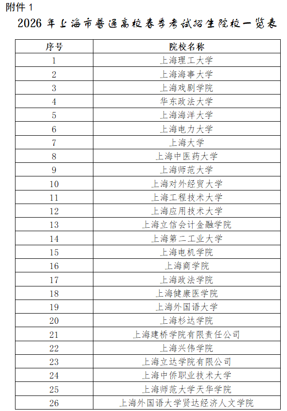附:2026年上海市普通高校春季考试招生院校一览表