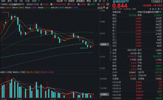 金融科技板块逆市活跃,金融IT方向多股上涨。其中,格尔软件斩获两连板,涨超5%,、、、等多股跟涨超2%。热门ETF方面,百亿金融科技ETF(159851)场内收涨0.72%,单日成交3.59亿元。日线低位两连阳,或释放右侧布局信号。
