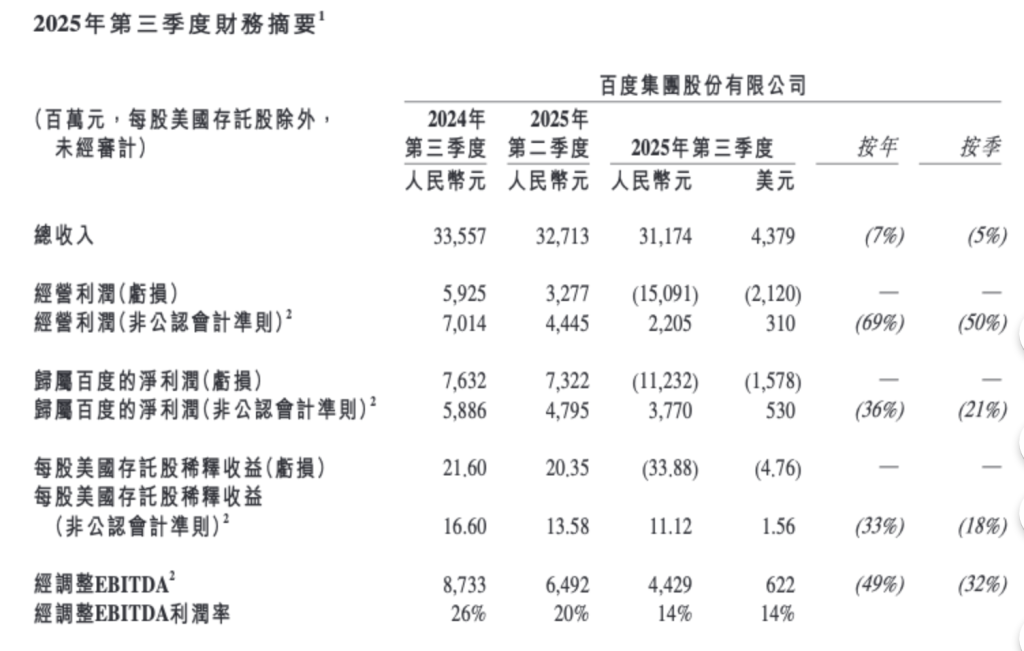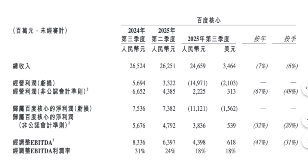 11月18日晚,百度(Nasdaq:BIDU,09888.HK)发布2025年第三季度财报,显示季度总营收312亿元,同比下滑7%,环比减少5%;非公认会计准则归属于百度的净利润为37.7亿元,同比减少36%,环比减少21%。