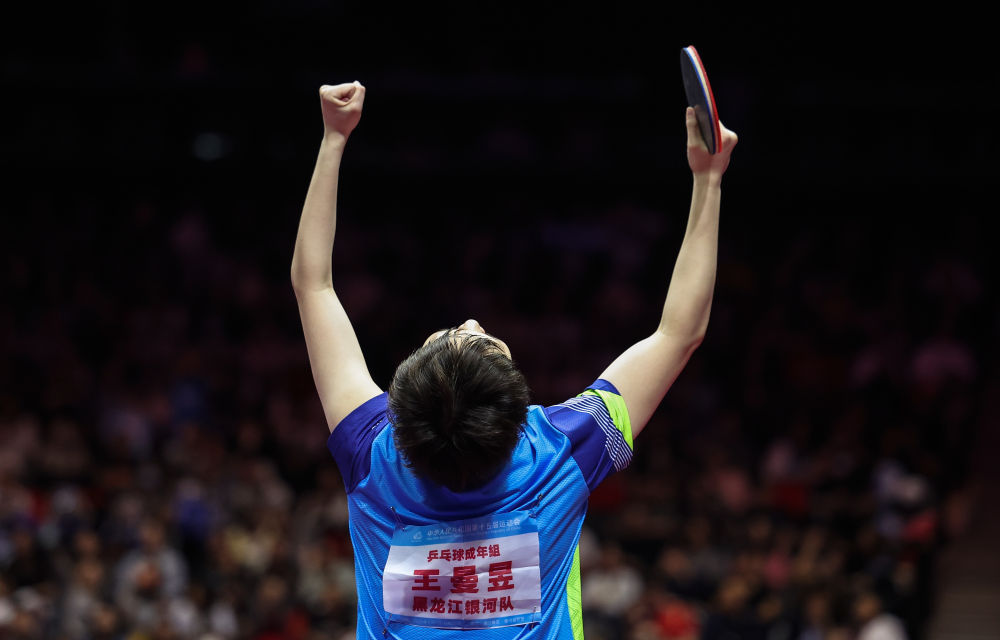 本届全运会乒乓球比赛11月7日至20日在澳门举行。王曼昱在16日进行的女单决赛中,以4:2战胜河北队选手孙颖莎,卫冕全运会女单冠军。在18日上午进行的女团四分之一决赛中,黑龙江队对阵江苏队,王曼昱两度出战,她先后以3:0的大比分战胜蒯曼和钱天一,帮助黑龙江队晋级女团半决赛。