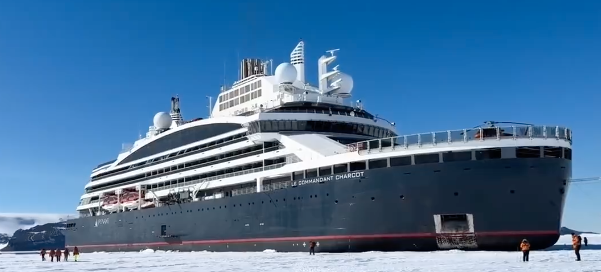 公开资料显示,“夏古号”邮轮全称为“指挥官夏古号”,是庞洛邮轮运营的全球首艘液化天然气驱动气电混合动力极地探险邮轮,具备PC2级破冰能力,船壳由Aker Arctic合作设计可实现双向破冰航行模式,可抵达地理北极点及南极威德尔海等极端区域。该邮轮设计载客量为245人,于2021年交付后,主要执行北极点、格陵兰东北部及南极威德尔海航线。