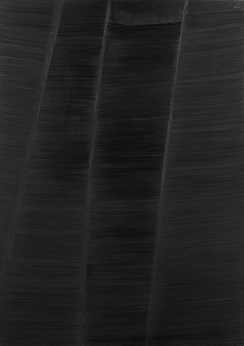 另一位“10”艺术家是出生于1919年的皮埃尔苏拉吉,在此《绘画 222157厘米, 1979年8月31日》以其标志性的黑色构成强烈视觉场域。作品通过不同方向与密度的笔触,使黑色在反光中呈现层次变化,在光线作用下形成具有空间深度的“黑之光”,体现了苏拉吉对色彩、材质与精神性的统一追求。
